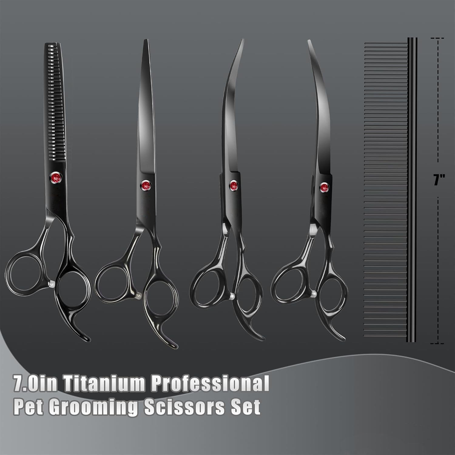7.0in Titanium Professional Dog Grooming Scissors Set, BITE 6 in 1 Straight & Thinning & Upwards Curved & Downwards Curved Scissors & Comb for Dogs, Cats and Other Animals