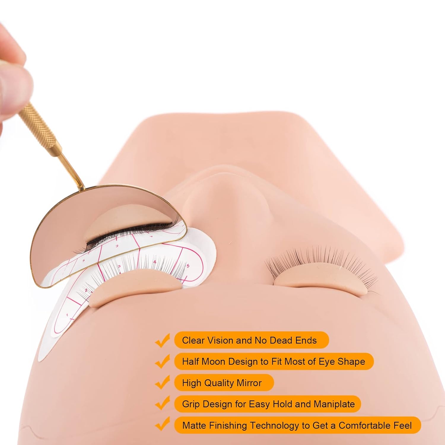 - HALF-MOON DESIGN & BIGGER VIEW: The lash extension mirror is designed as cute half-moon shape to fit for most of eye types, the high quality mirror can provide to you a full view and clear vision, No any dead ends when do lash application inspection for lash tech.