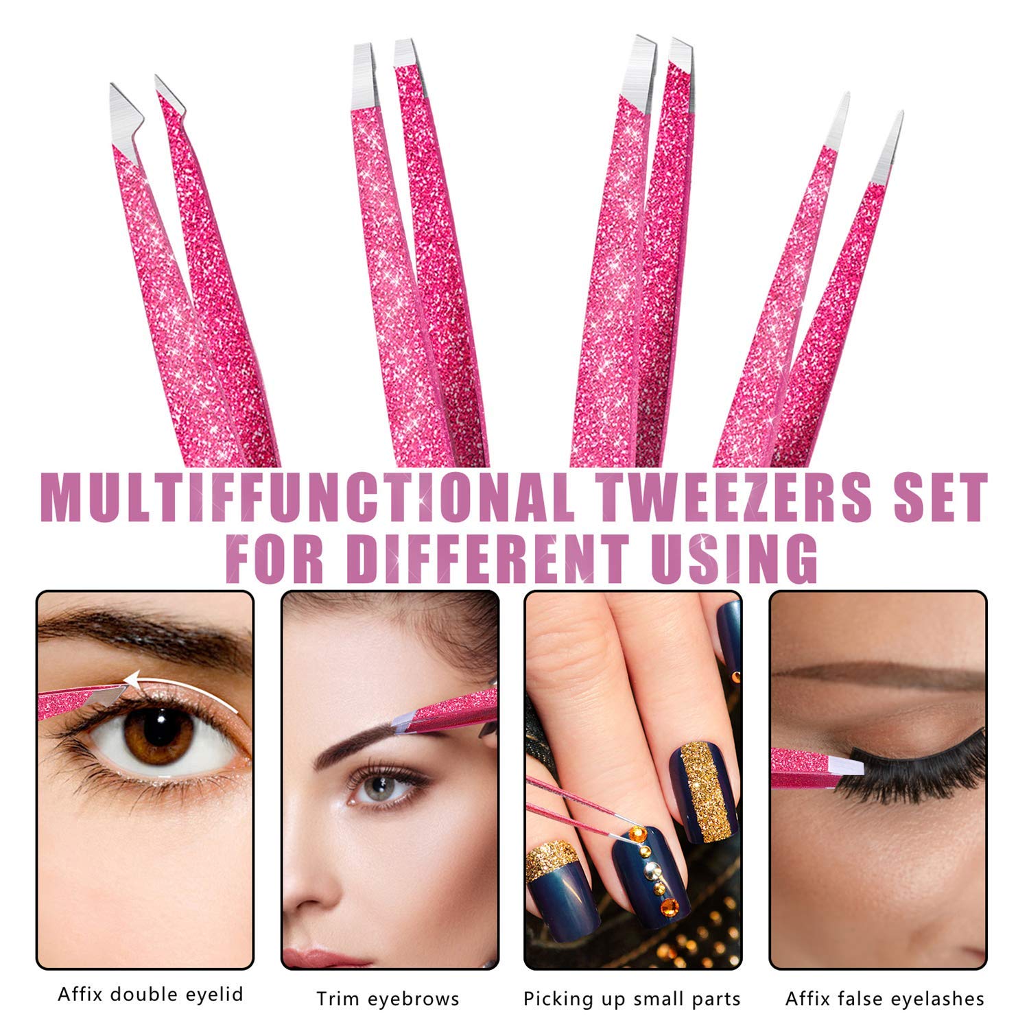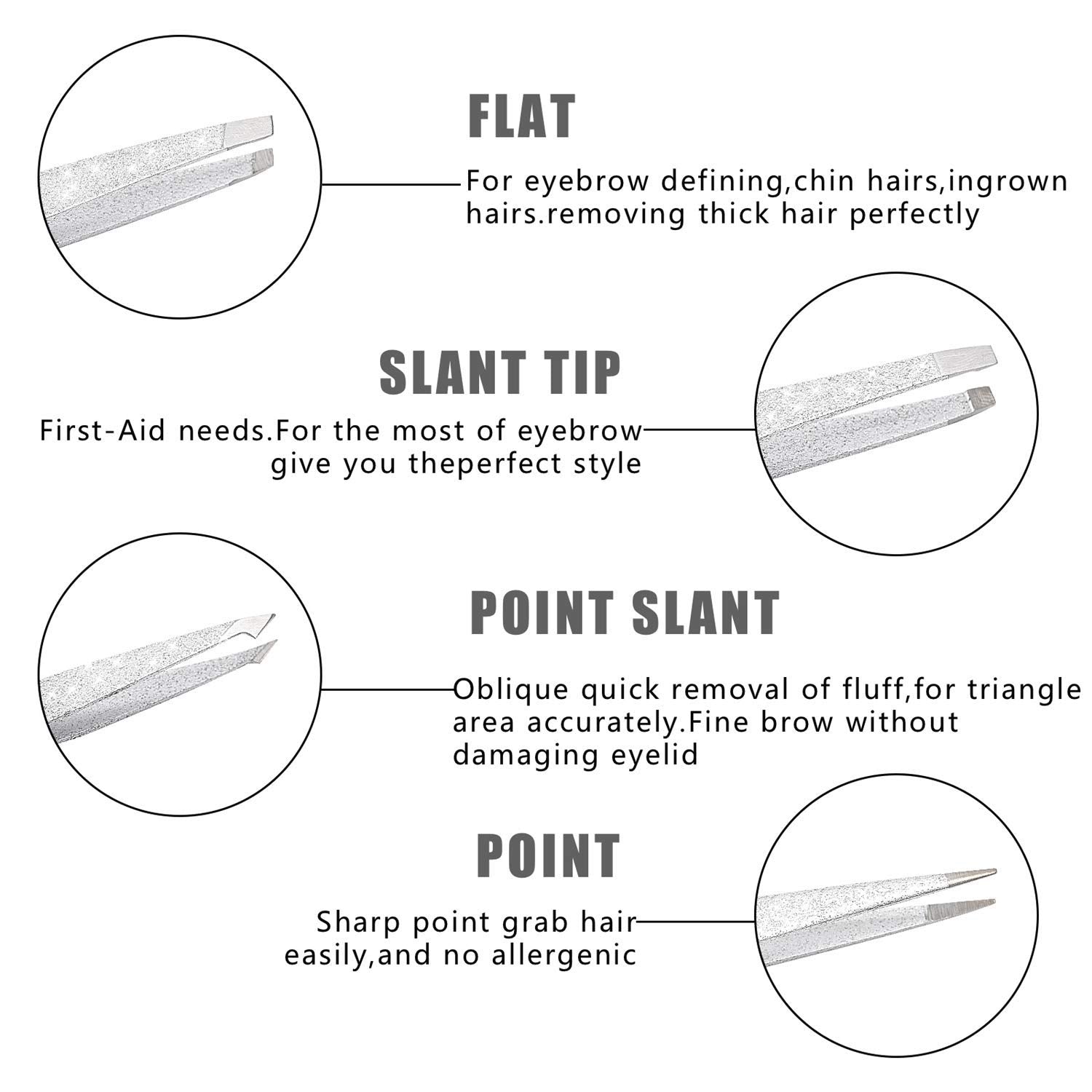 - ❤ 【Multiple Uses-4 in 1 Set】 – 4 different professional precision tweezers are included in this kit ,range from Slant Tweezer, Pointed Tweezer, Pointed-Slant Tweezer, Flat Tweezer. They can not only work well for plucking eyebrows precisely and griping or removing small and short individual hair, but also perfect for false lashes and double eyelid affixing. Even you can use these precision tweezers for craft, jewelry-making, electronics, laboratory work, etc.