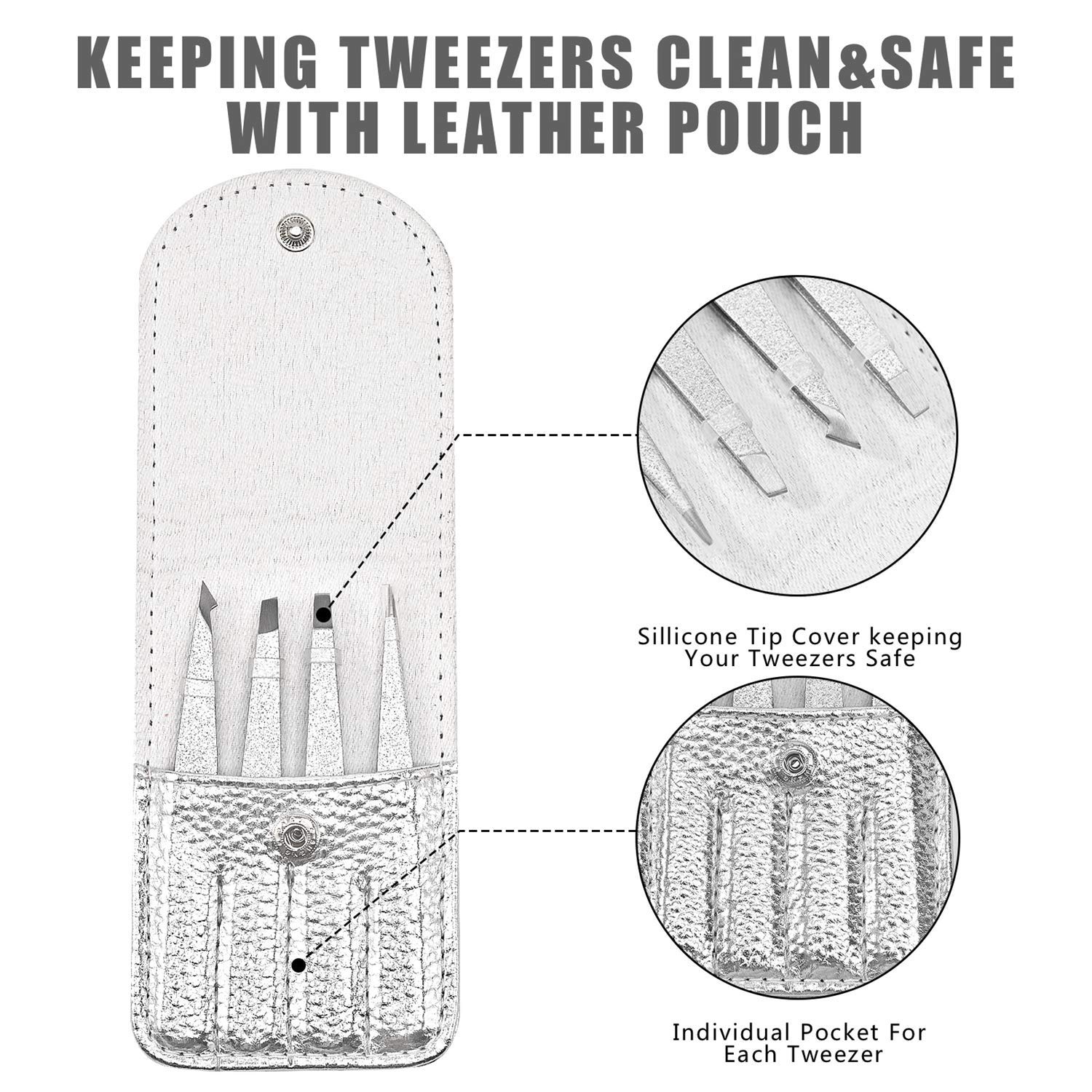 - ❤ 【Best Gift With Exquisite Leather Case】 – The portable high class leather case make this professional tweezers set great for emergency usage, it comes with a little leather case, each tweezer has a individual pocket to keep eyebrow tweezers clean and not as easy to lose, With silicone tip cover to keep tweezers safe .The leather case is portable and lightweight that slips easily into pocket, purse ,gym bag, Stylish with convenient travel case also is the best gift for your lover or friend.