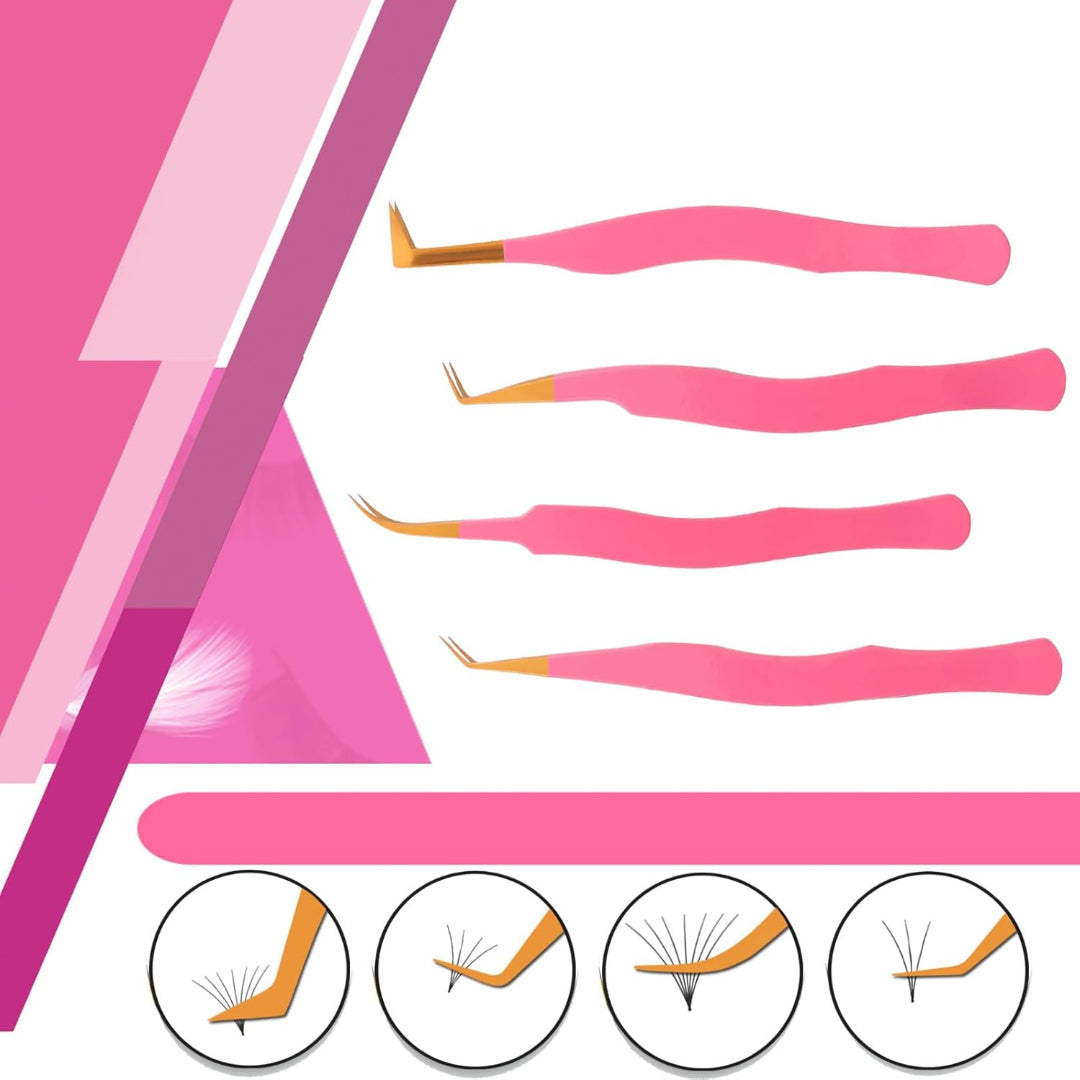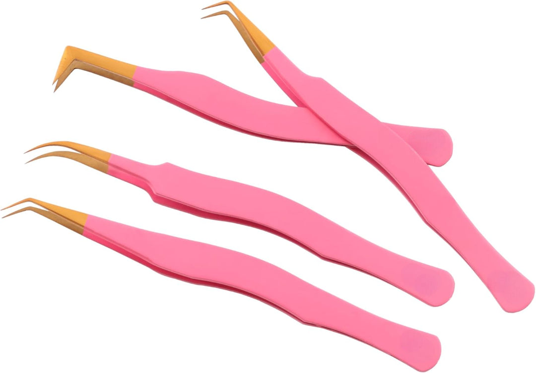 Each tweezer in this set features a vibrant pink handle for a comfortable grip and easy identification, paired with elegant gold-toned necks and precision tips crafted from durable stainless steel (assumed). This combination ensures both longevity and the accuracy required for flawless lash applications.