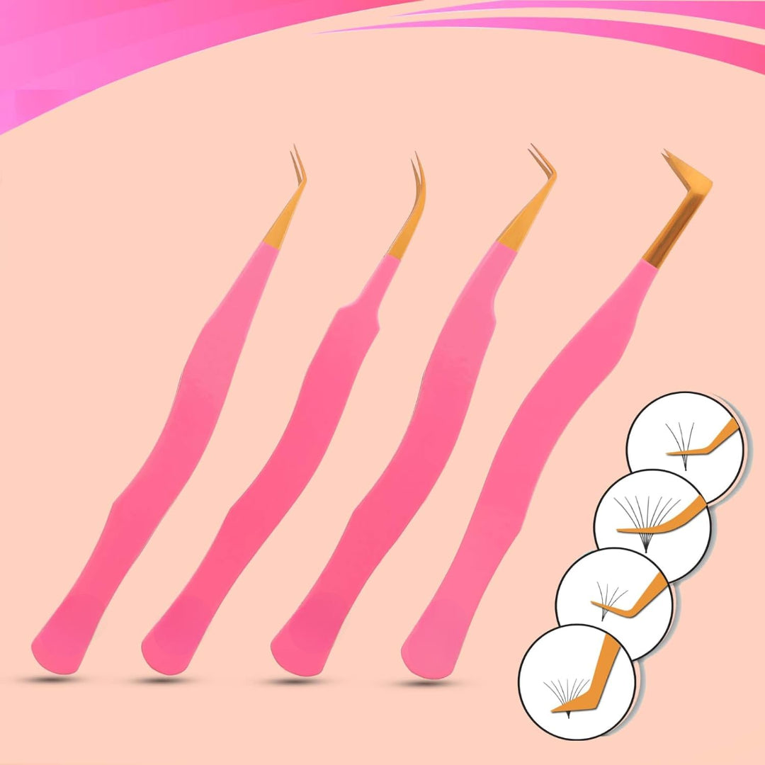 Bite Instruments Pink & Gold 4-Piece Eyelash Tweezer Set | Precision Tools for Volume & Classic Lashes