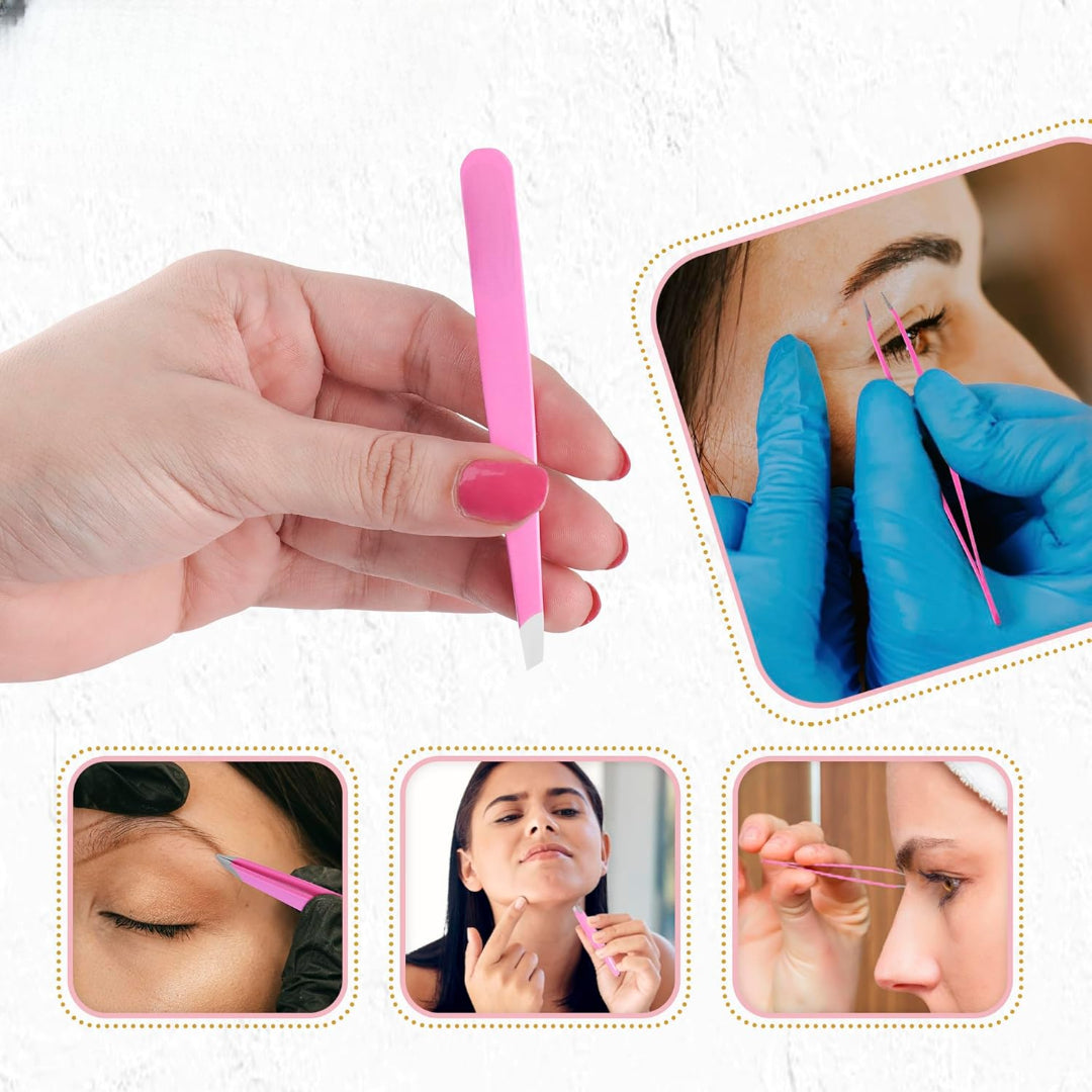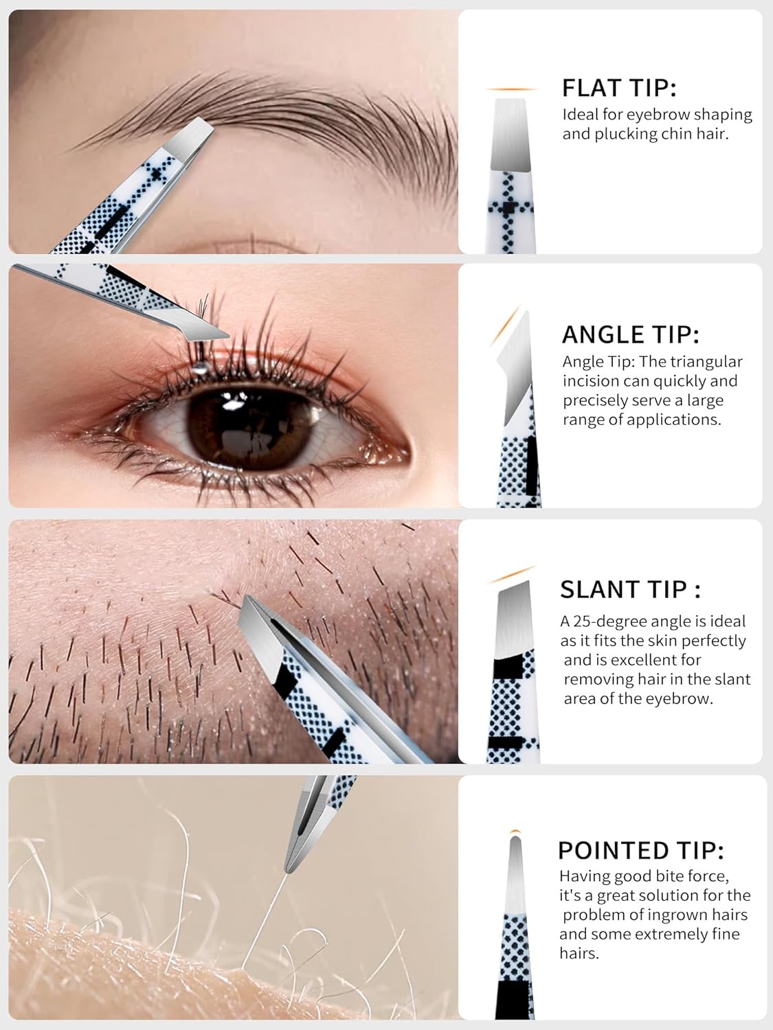 • VALUE TWEEZERS SET: The 4pcs tweezer set comes with 4 precision stainless steel eyebrow tweezers for women, and includes slant tip, angle tip, flat tip, and pointed tip. These precision tweezers are exquisitely crafted with professional expertise to handle a range of grooming tasks, from tweezers for women facial hair to other delicate areas.