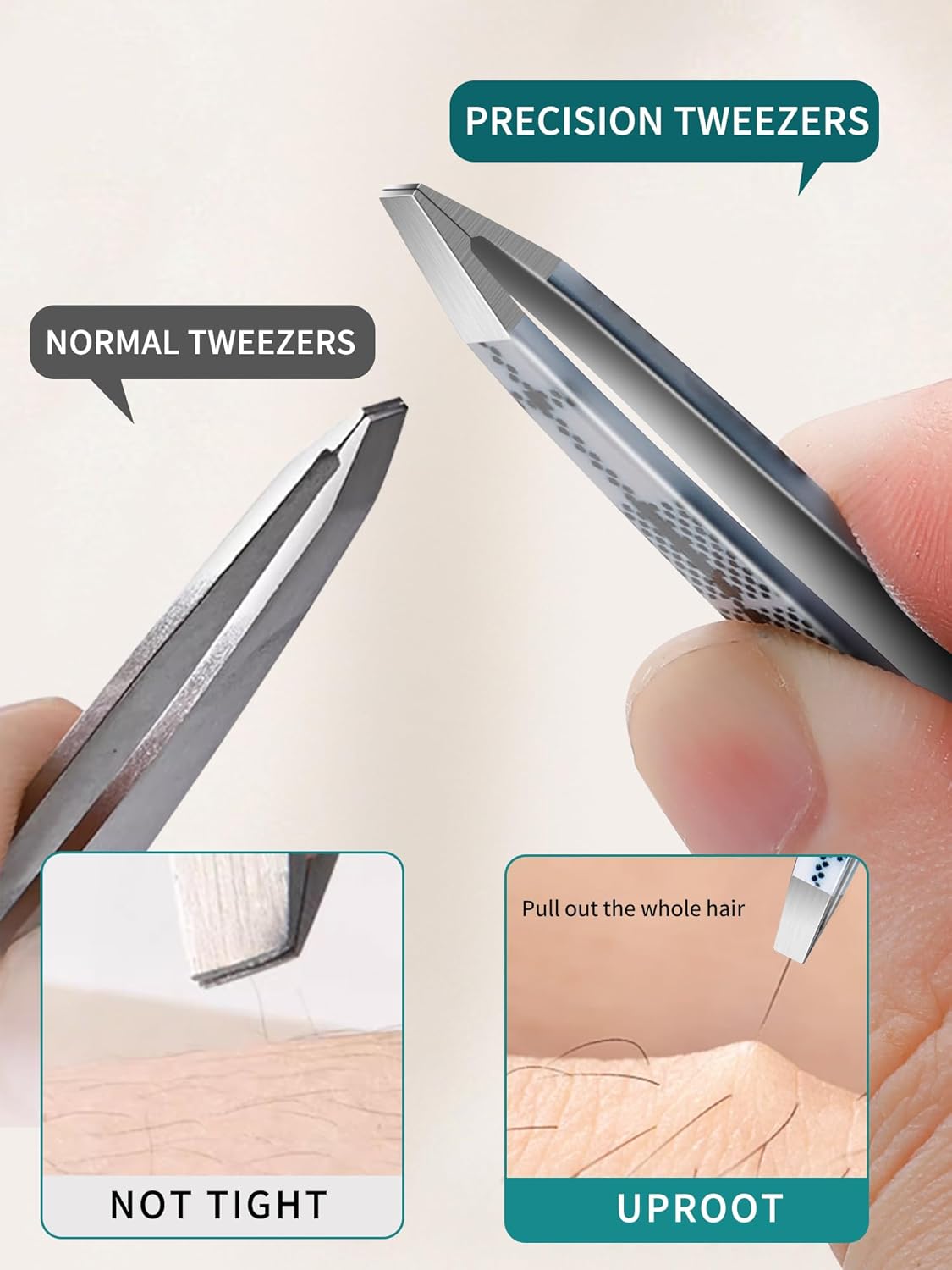 • PLUCKING RELIEVES PAIN: The tweezers for men and women are carefully aligned with precision, and the tension is calibrated to reduce pain while plucking. These sharp tweezers can tightly grip the roots of ingrown hairs, providing a comfortable and precise grooming experience without excessive pressure. Best tweezers for chin hair.