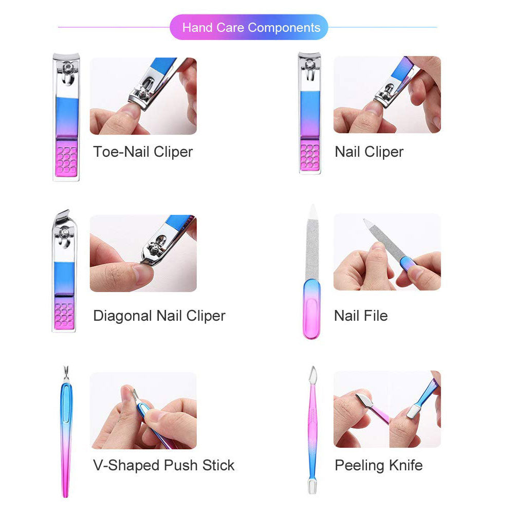 Bite Instruments Rainbow Manicure & Pedicure Kit. This 15-in-1 professional grooming set comes with vibrant rainbow-finish tools for trimming, shaping, and maintaining nails effortlessly. Perfect for both men and women, the set includes high-quality nail clippers, cuticle nippers, tweezers, nail file, scissors, and pedicure tools—all neatly stored in a stunning gradient pink-to-blue travel case.