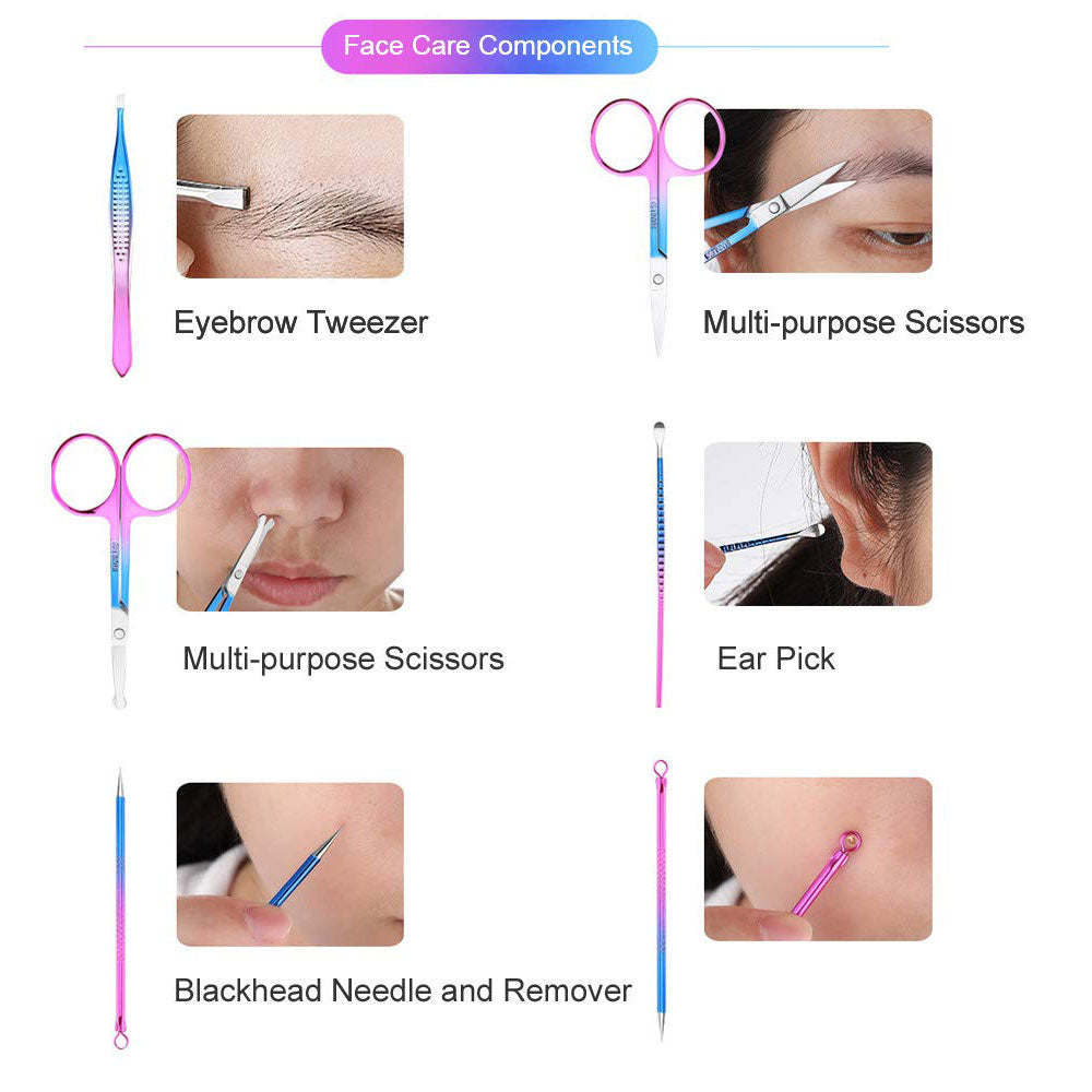 18 Pieces in 1: Toe Clipper, Nail Clipper, Mini Clipper, Brow Clipper, Cuticle Clipper, Cuticle Pusher, Nail File, Ear Pick, Callus Scrapper, Acne Pick ,and Tweezers. We also include a Microfiber cloth to polish the tools, and free them of any finger prints.