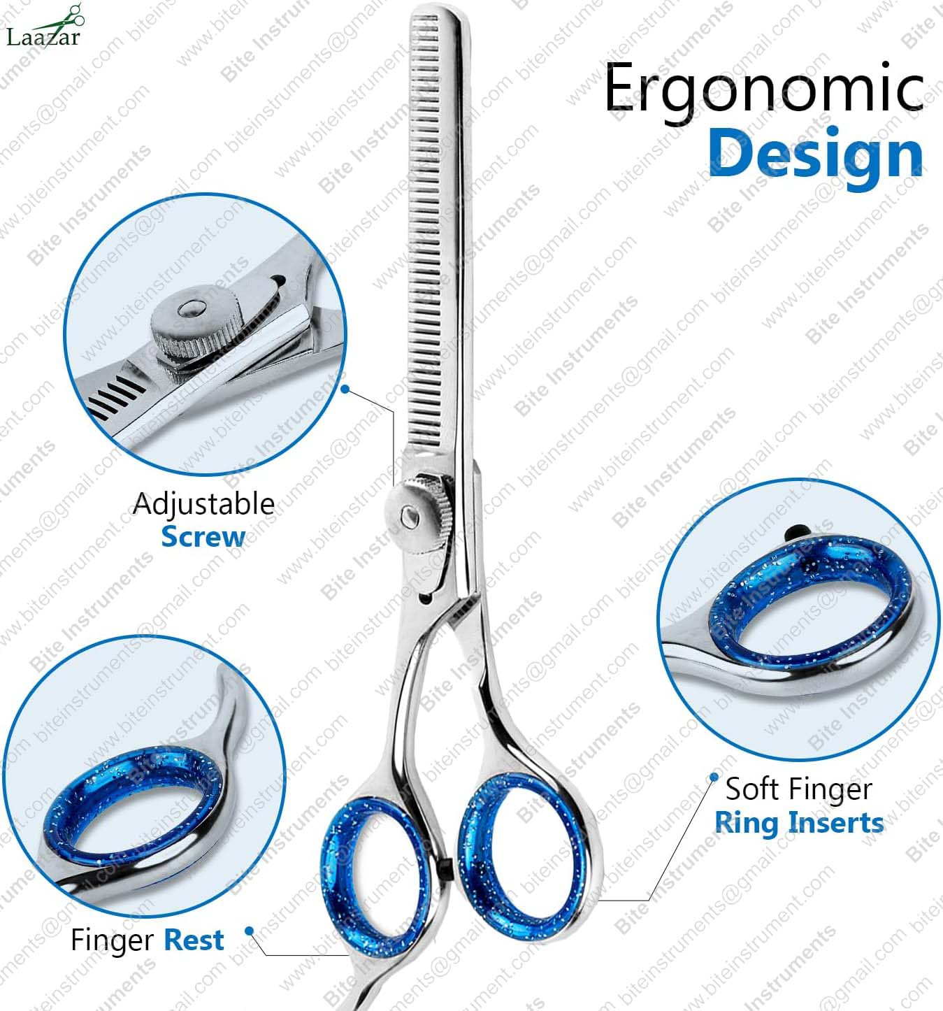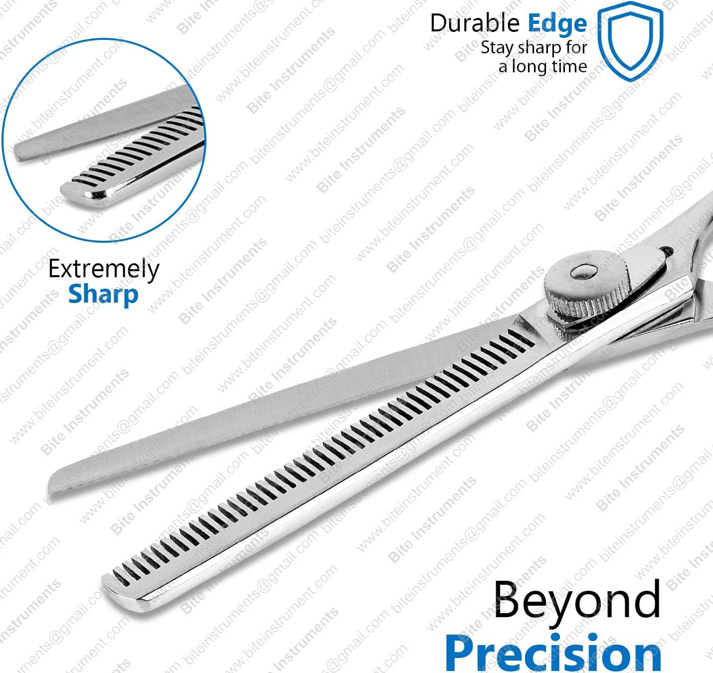 • ✔️ Comfortable & Smooth Motion – The handle of these texturizing scissors is designed to perfectly fit the hand, so the cut is more precise and the comfort is increased. The joint of the blades is professionally made, which is why the motion and the adjustment of these thinning shears are very fine, with long-lasting resistance and reduced sound to motion.