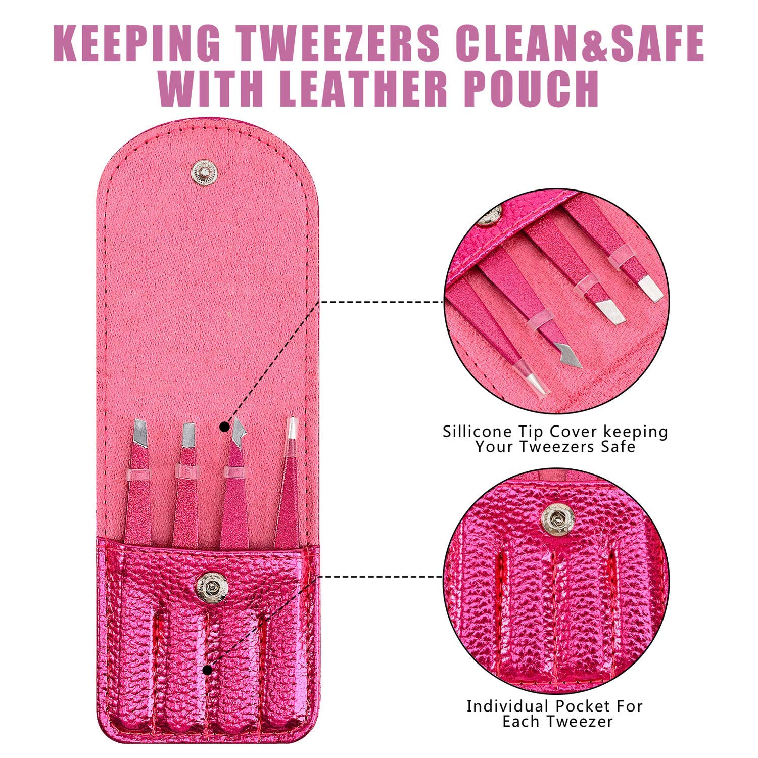 - ❤ 【Best Gift With Exquisite Leather Case】 – The portable high class leather case make this professional tweezers set great for emergency usage, it comes with a little leather case, each tweezer has a individual pocket to keep eyebrow tweezers clean and not as easy to lose, With silicone tip cover to keep tweezers safe .The leather case is portable and lightweight that slips easily into pocket, purse ,gym bag, Stylish with convenient travel case also is the best gift for your lover or friend.
