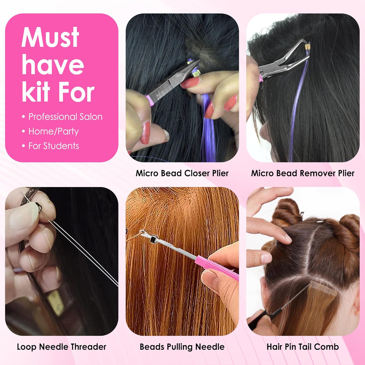 - Professional all-in-one micro link tool kit includes: Hair extensions micro beads closer plier, hair extension beads remover plier, hair extension loop needle threader pulling hook bead device tool.