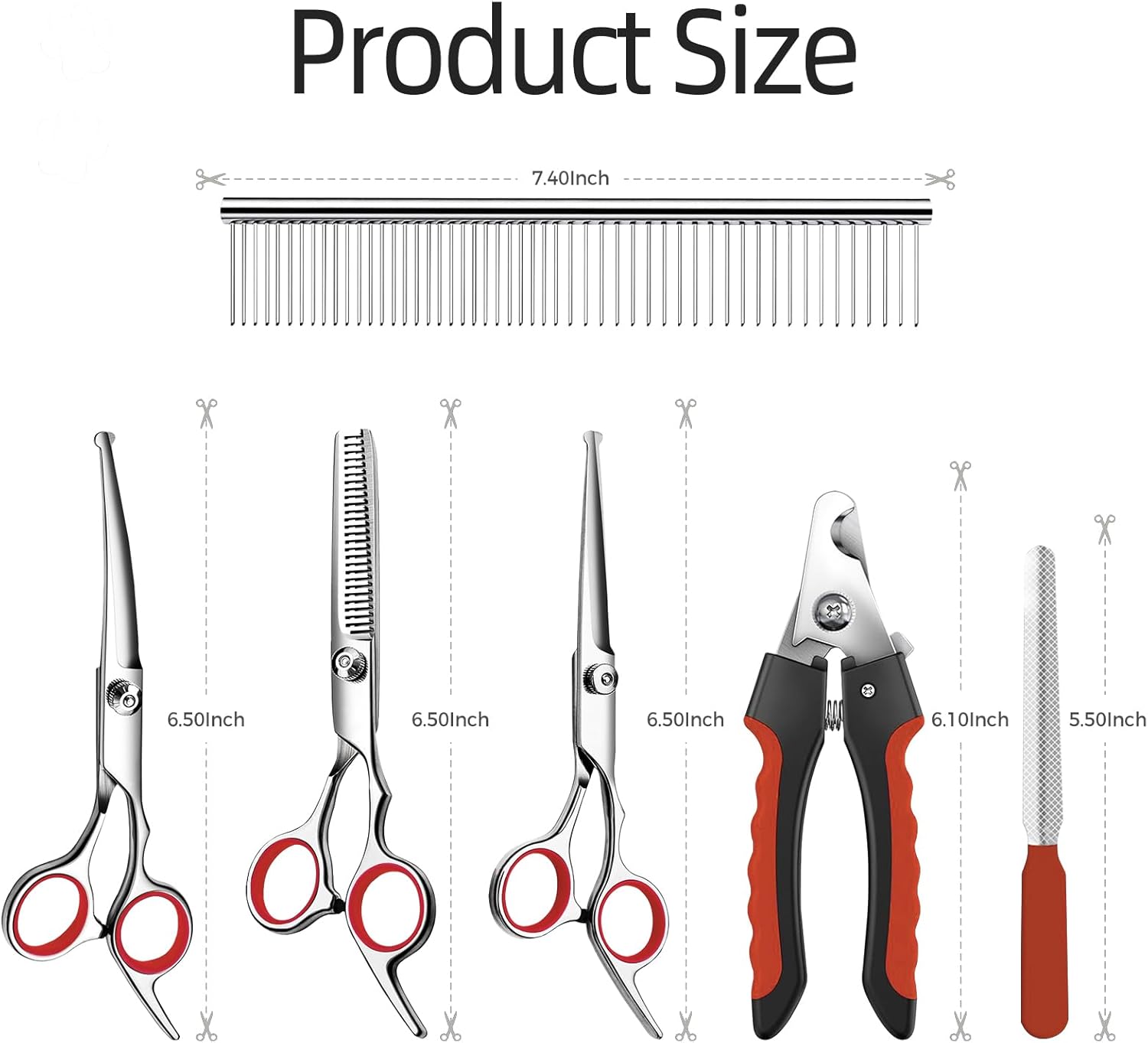 - Complete 6-in-1 Kit: Includes a versatile set of three stainless steel grooming scissors (straight, thinning, and detail/curved scissors), a durable grooming comb, powerful nail clippers, and a nail file, covering all essential grooming tasks.