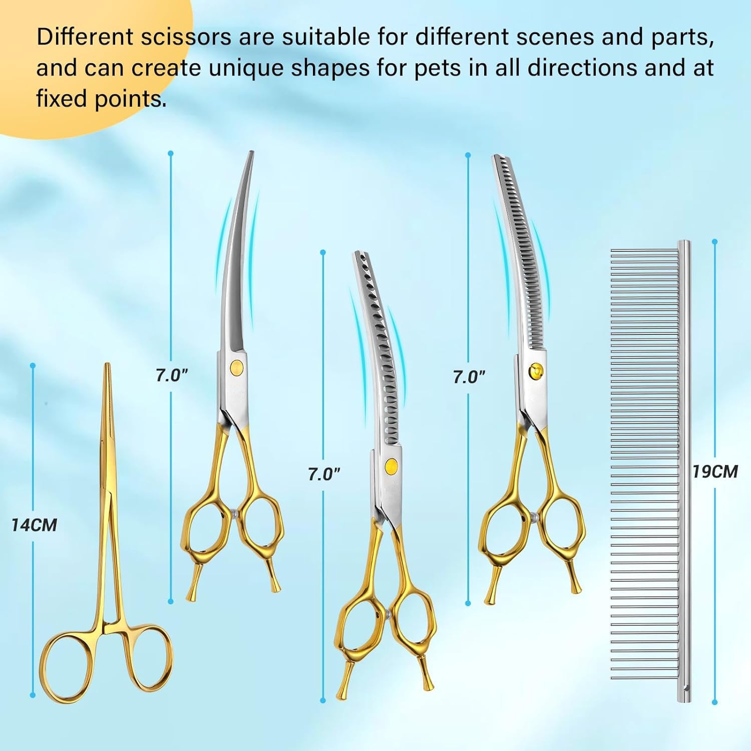 - Comprehensive 5-in-1 Kit: Includes a 7.0″ straight scissor, a 7.0″ thinning scissor, a 7.0″ curved scissor, a 14CM detail/facial trimmer (forceps-style), and a 19CM grooming comb, providing a complete range of tools for every grooming need.