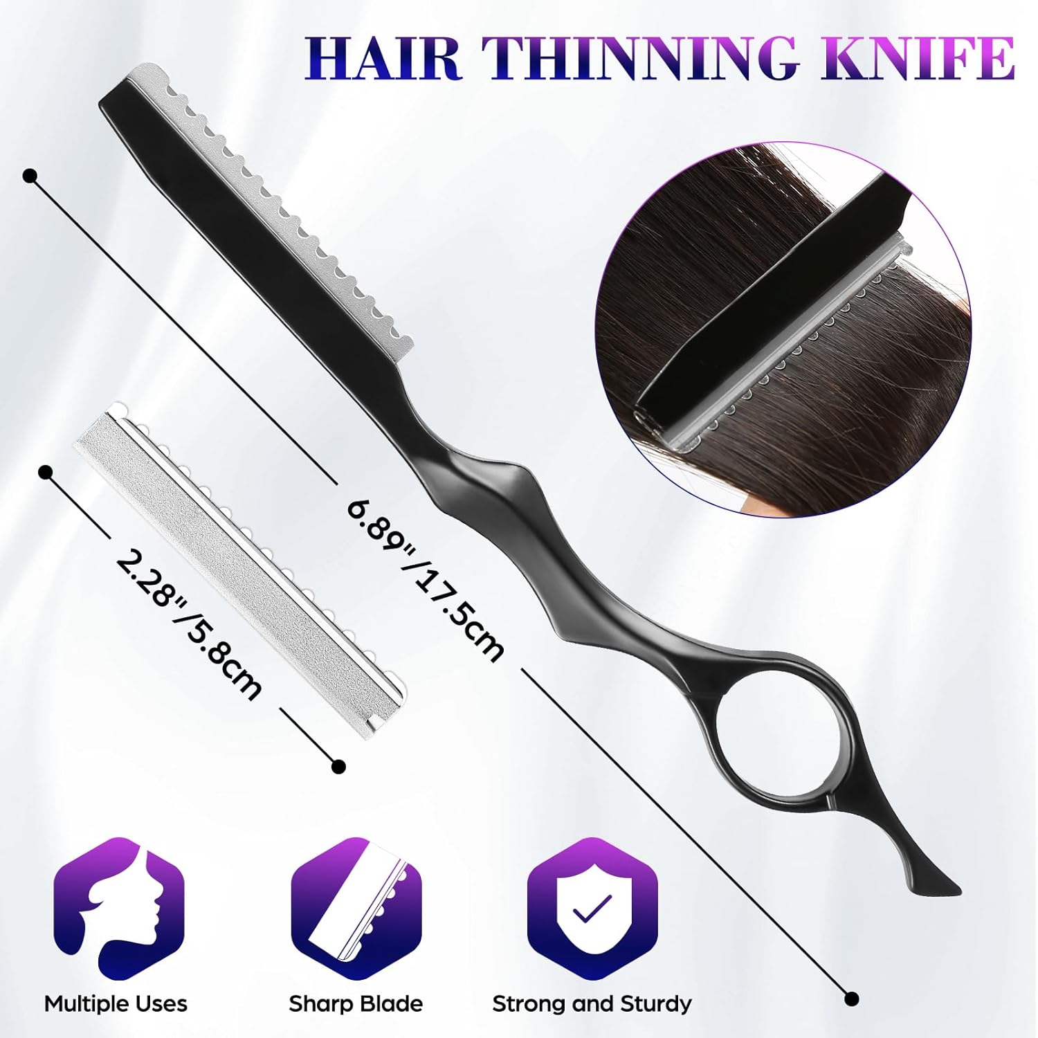 - ✄【Versatile Hair Scissors Set】: This set includes 2 straight scissors, 1 hair thinning scissors, 1 hair thinning knife, 1 hair comb, 1 hair clip, 1 leather bag, 1 cleaning cloth, and 1 adjustable screw, making it perfect for both professional salon use and home use.