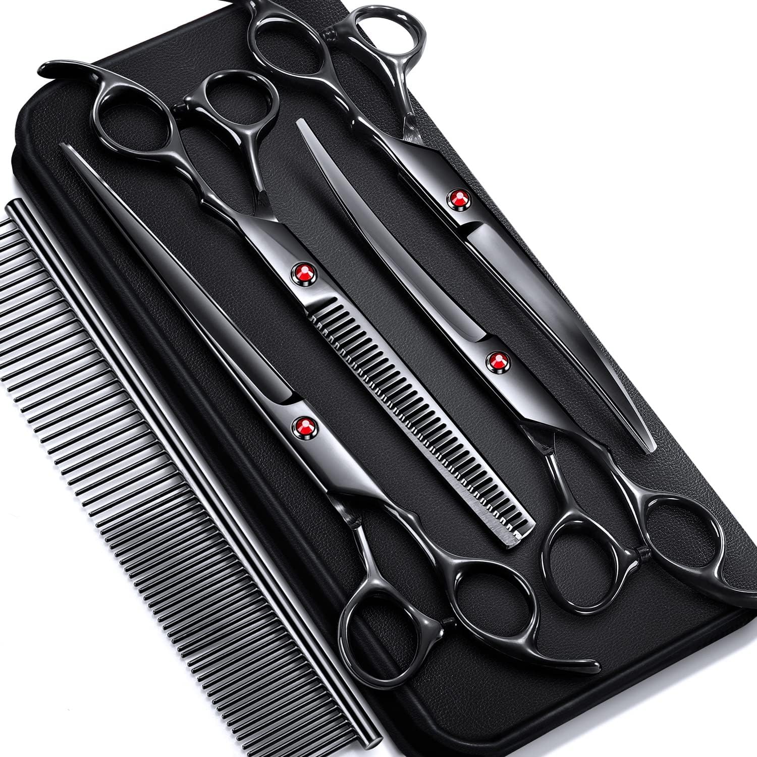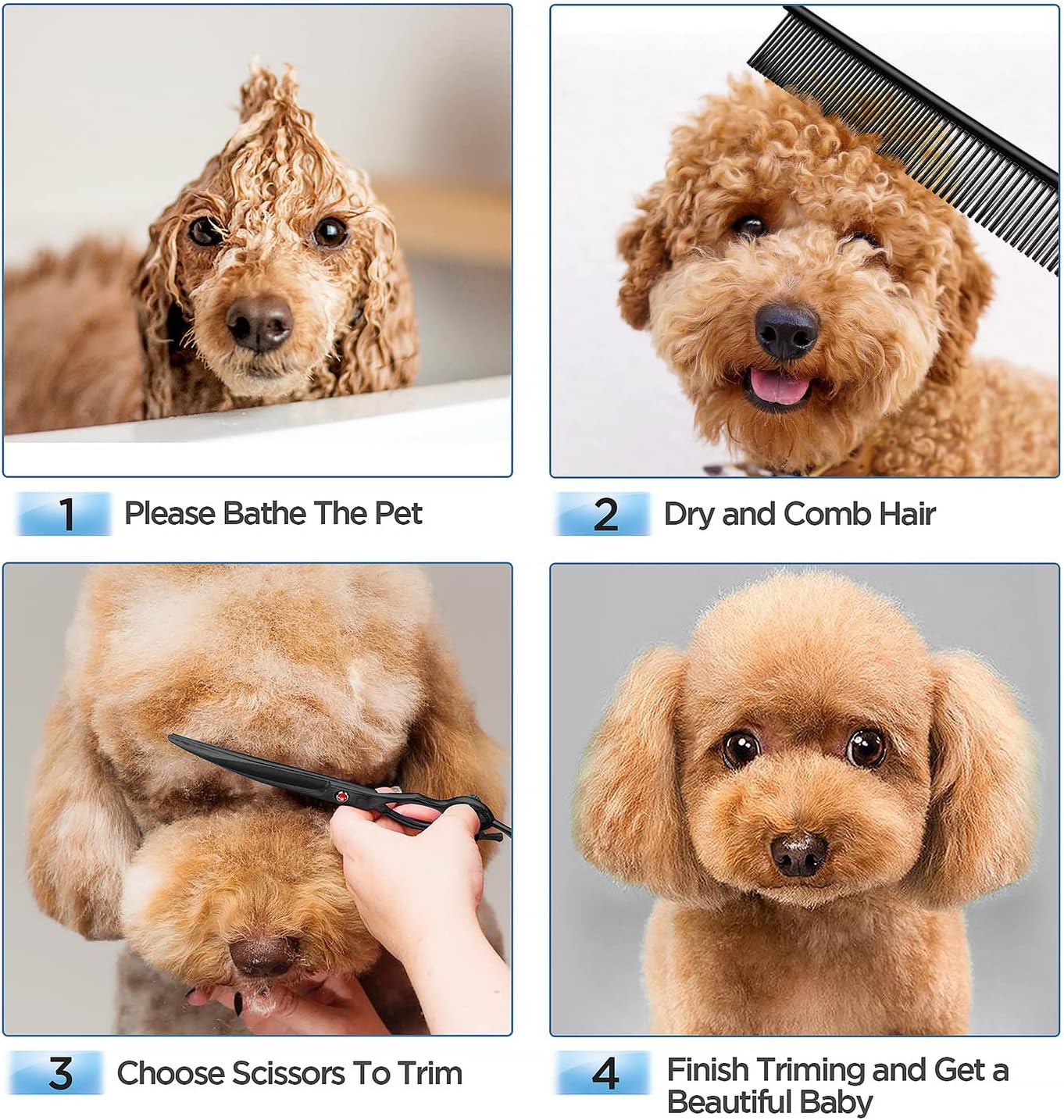 - Complete 6-in-1 Set: Includes straight, thinning, and curved scissors, plus a grooming comb, covering all essential styling needs for your pet’s coat.