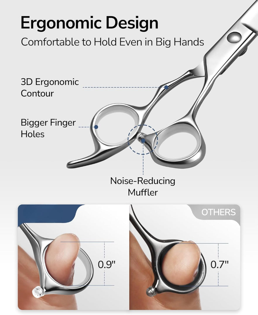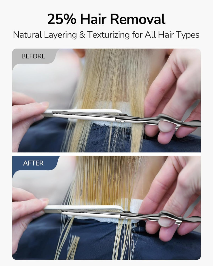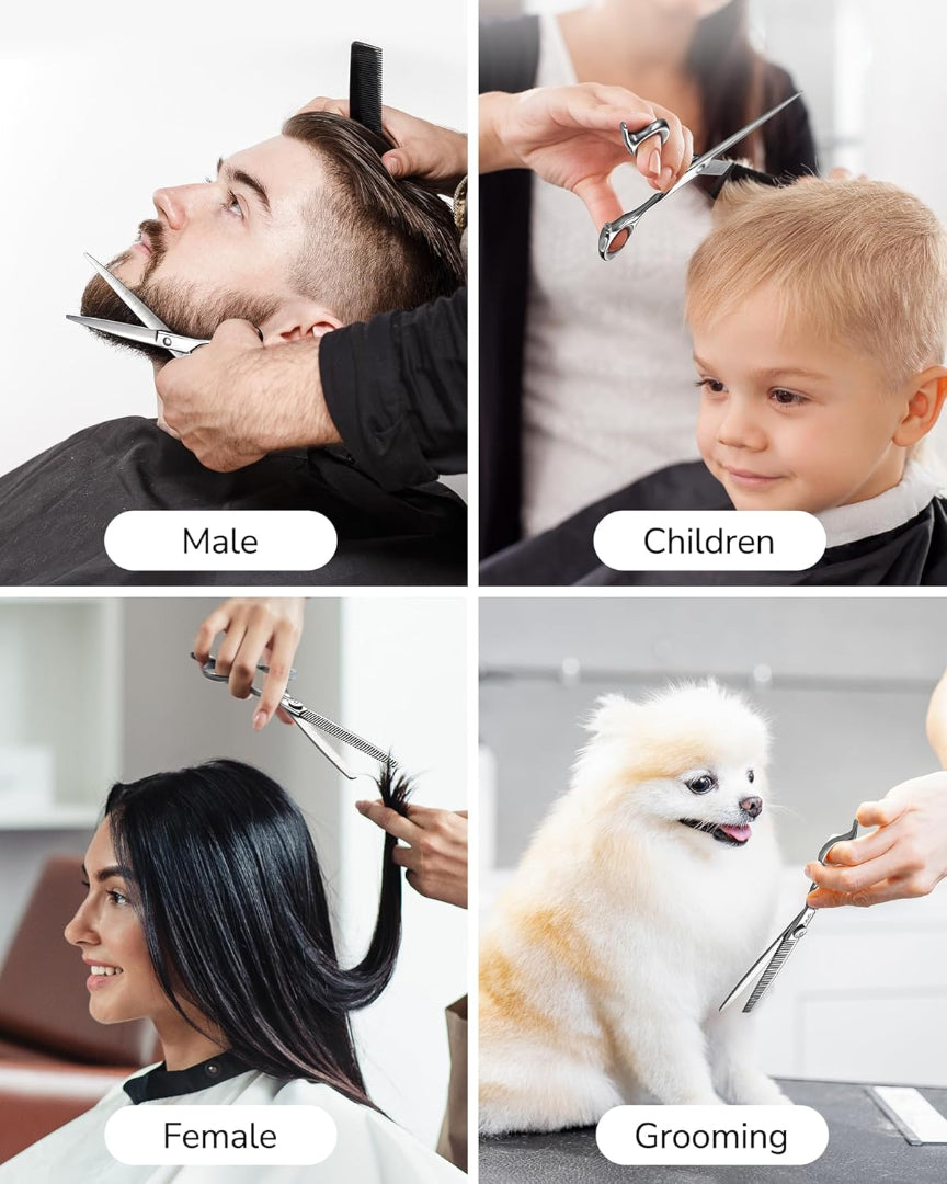 • Precision Cutting & Blending: The sharp hair cutting scissor offers clean, precise cuts, while the thinning scissor allows for seamless blending and texturizing, achieving desired volumes and styles.