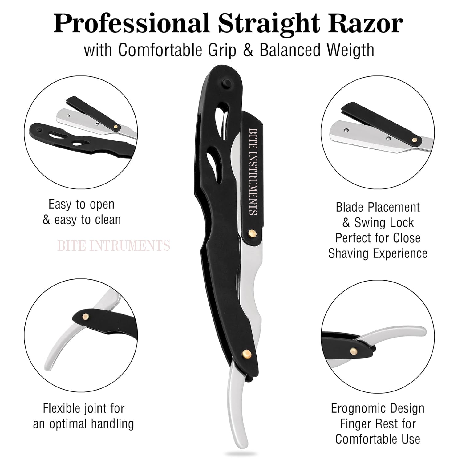 Experience the art of traditional shaving with the Bite Instruments Professional Straight Razor, designed for barbers and men who want a clean, precise shave. This straight edge safety razor combines a sleek ergonomic handle with a replaceable blade system, offering the perfect balance of comfort, sharpness, and safety.