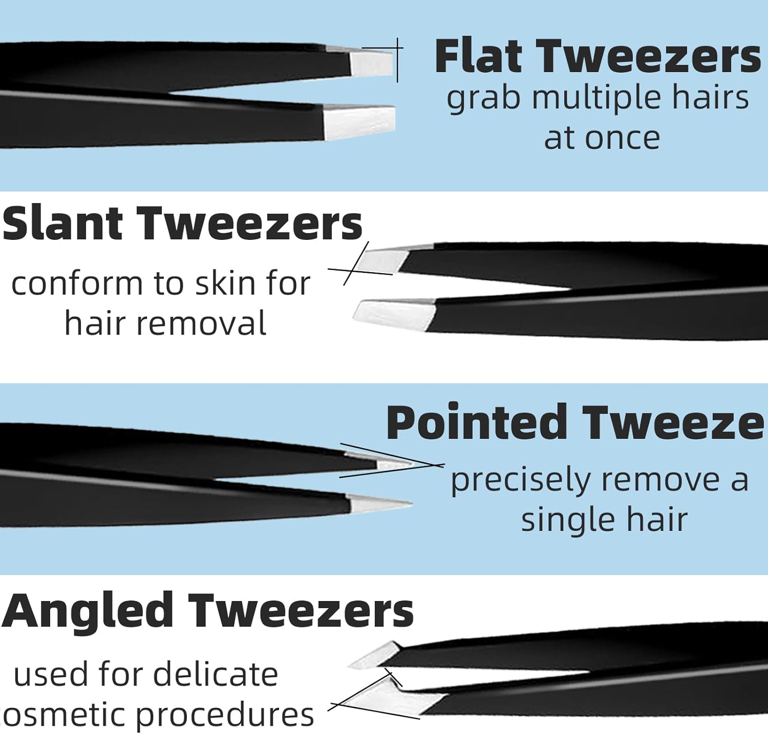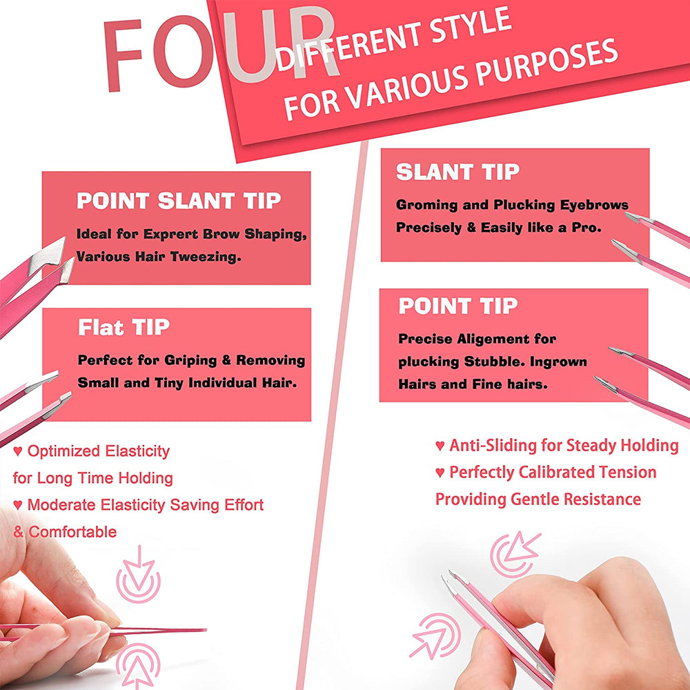 • 【Multi Function】: Eyebrow tweezers sets are flat head, angle head, inclined head and pointed head, which can remove hair from different parts of the body. It is also suitable for various fine handmade to meet various needs. It is a perfect set.