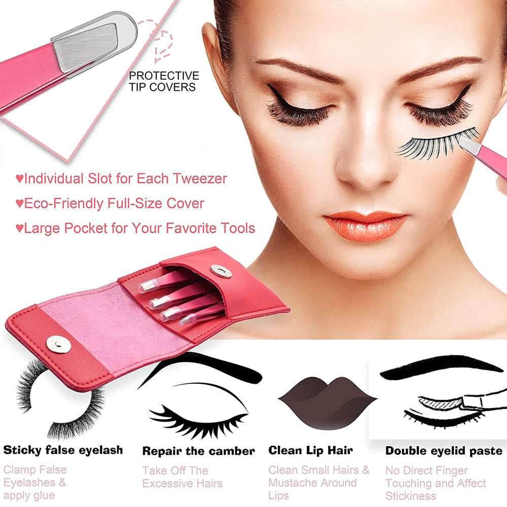 • ❤ 【Multiple Uses – 4 in 1 Set】  In this package, you will find four distinct professional precision tweezers: Slant Tweezer, Pointed Tweezer, Pointed-Slant Tweezer, and Flat Tweezer. In addition to being excellent at carefully plucking eyebrows and holding onto or removing tiny, short individual hairs, they are also ideal for applying fake eyelashes and double eyelids. These precise tweezers can also be used for jewelry-making, electronics, crafts, lab work, and more.